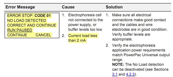 PAGE凝膠電泳期間,電流下降至低于1 mA很常見(jiàn)。有些電泳電源如伯樂(lè)電源有負(fù)載檢查功能,電流過(guò)低(低于4mA) 會(huì)認(rèn)為沒(méi)有負(fù)載,報(bào)錯(cuò)E1錯(cuò)誤代碼,終止電泳。解決方法是更換電泳電源,如使用國(guó)產(chǎn)電源;另外可以調(diào)高電壓高于300 V,使得電流不要低于4mA。