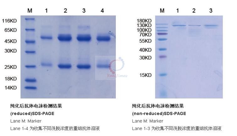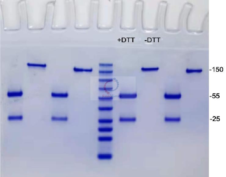 如需測(cè)定目標(biāo)蛋白的純度及分子量(為多聚體分子量),則一般采用非還原SDS-PAGE:采用該電泳方法,二聚體、多聚體在凝膠中的位置會(huì)處于單體分子量2倍或多倍的位置,利于觀察及各組分的定性定量分析。當(dāng)然這種蛋白的聚體形成是依靠二硫鍵來(lái)維持的。