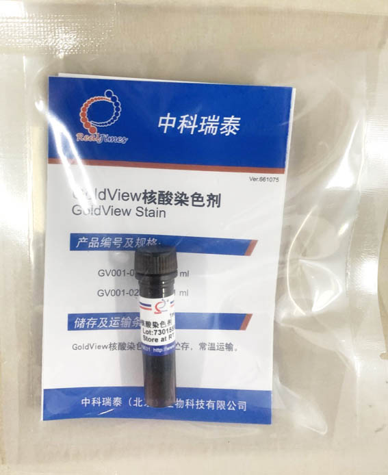 GoldView 是一種可代替溴化乙錠(EB)的新型DNA染料,其靈敏度與EB相當(dāng),使用方法與之完全相同。在紫外燈下雙鏈DNA呈現(xiàn)綠色熒光。通過小鼠皮下注射實驗,尚未發(fā)現(xiàn)GoldView有致癌作用。