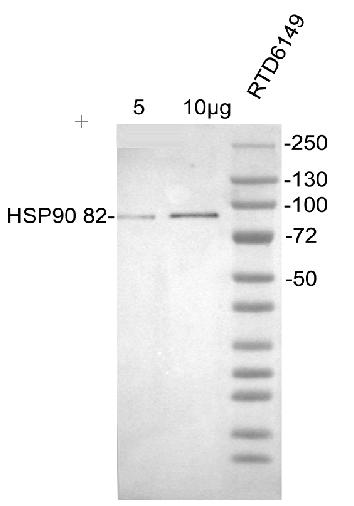 熱激蛋白(Heat Shock Proteins ,HSPs)是生物體在高于正常生長溫度刺激或高鹽、干旱等脅迫條件下誘導(dǎo)合成的應(yīng)激蛋白,1962年首次在果蠅中發(fā)現(xiàn)。按分子量可分為HSP100、HSP90、HSP70、HSP60及小分子量家族(smHSPs),分子量范圍15-110 kD。HSP90已經(jīng)在各種物種的細胞中發(fā)現(xiàn),并且在免疫原性及物理特征上都比較相似,具有高度保守性,在細胞中的表達相對穩(wěn)定,因此它常被用于校正系統(tǒng)的內(nèi)參。本抗體經(jīng)常作為各種模式生物如擬南芥,水稻等的內(nèi)參。