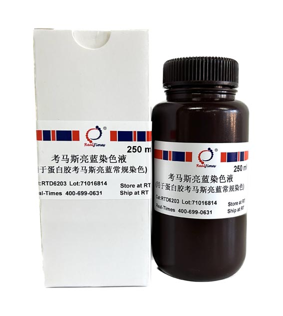 考馬斯亮藍染色液(Commassie Blue Staining Solution)是以考馬斯亮藍G-250為主要成分,采用新配方配置而成??捎糜赟DS-PAGE或非變性PAGE膠(native