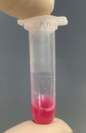 2. 向菌體沉淀的離心管中加入250 μl溶液P1(請先檢查是否已加入RNaseA)和5μl Lysis Dye,使用移液器或渦旋振蕩器徹底懸浮細(xì)菌細(xì)胞沉淀,此時(shí)溶液為渾濁的紅色。