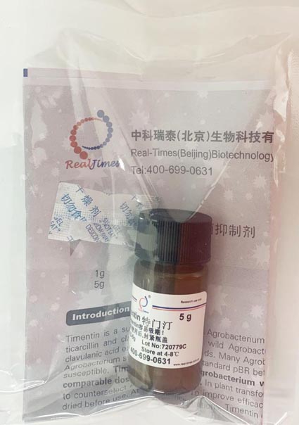 Potassium),按有效酸計,替卡西林鈉與克拉維酸鉀的配比為15:1,替卡西林是青霉素類殺菌試劑,而克拉維酸則是一種不可逆性高效β-內(nèi)酰胺酶抑制劑。多種革蘭氏陽性菌(G+)和陰性菌(G-)都能產(chǎn)生β-內(nèi)酰胺酶,這類酶能在青霉素作用于病原體之前將其破壞??死S酸通過阻斷β-內(nèi)酰胺酶破壞細菌的防御屏障,恢復替卡西林敏感性??死S酸鉀單獨抗菌作用甚微,但與替卡西林配置后使本品成為具有廣譜殺菌作用的抗生素,適用于對廣泛的細菌感染性疾病的經(jīng)驗治療。在科研中常用于抑制農(nóng)桿菌生長,特別在胚性愈傷組織再生系統(tǒng)中,能達到很好的抑菌和再生效果。