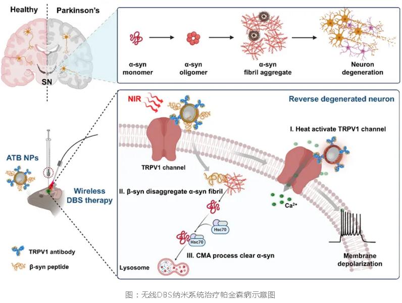 基于此,研究團(tuán)隊(duì)設(shè)計(jì)了一種光熱無(wú)線DBS納米系統(tǒng),命名為ATB NPs。這一系統(tǒng)通過(guò)直接刺激神經(jīng)元內(nèi)源性表達(dá)的熱敏TRPV1受體,實(shí)現(xiàn)對(duì)退化神經(jīng)元的精準(zhǔn)調(diào)控。該系統(tǒng)由三個(gè)核心模塊組成:光熱轉(zhuǎn)換模塊(金納米殼AuNSs),用于激活熱敏TRPV1離子通道;靶向模塊(TRPV1抗體),靶向高表達(dá)TRPV1受體的多巴胺能神經(jīng)元;降解模塊(β-syn多肽,含近紅外響應(yīng)連接體),通過(guò)結(jié)合α-syn的非淀粉樣蛋白-β成分疏水結(jié)構(gòu)域,降解α-syn纖維。通過(guò)立體定位技術(shù)將ATB NPs注射至PD小鼠的黑質(zhì)后,ATB NPs借助TRPV1抗體錨定在多巴胺能神經(jīng)元表面。在808 nm脈沖近紅外激光照射下,ATB NPs作為納米天線進(jìn)行光熱轉(zhuǎn)換,激活熱敏TRPV1受體,引起Ca2+內(nèi)流和動(dòng)作電位產(chǎn)生。同時(shí),ATB NPs釋放β-syn多肽,并通過(guò)激活分子伴侶介導(dǎo)的自噬途徑,清除α-syn聚集體,從而減少病理性纖維。最終,ATB NPs恢復(fù)了多巴胺能神經(jīng)元的交互網(wǎng)絡(luò)及多巴胺釋放能力,改善PD小鼠的運(yùn)動(dòng)功能。該無(wú)線DBS納米系統(tǒng)的優(yōu)勢(shì)主要包括:利用黑質(zhì)多巴胺能神經(jīng)元內(nèi)源性表達(dá)的TRPV1受體,無(wú)需植入神經(jīng)電極或進(jìn)行基因操作;結(jié)合近紅外激光技術(shù),能夠?qū)μ囟X區(qū)的退行性神經(jīng)元實(shí)現(xiàn)精準(zhǔn)的時(shí)空調(diào)控;無(wú)線DBS納米系統(tǒng)具有良好的生物安全性。這種基于納米顆粒的無(wú)線DBS治療策略為帕金森病及其他神經(jīng)退行性疾病的治療提供了新思路。