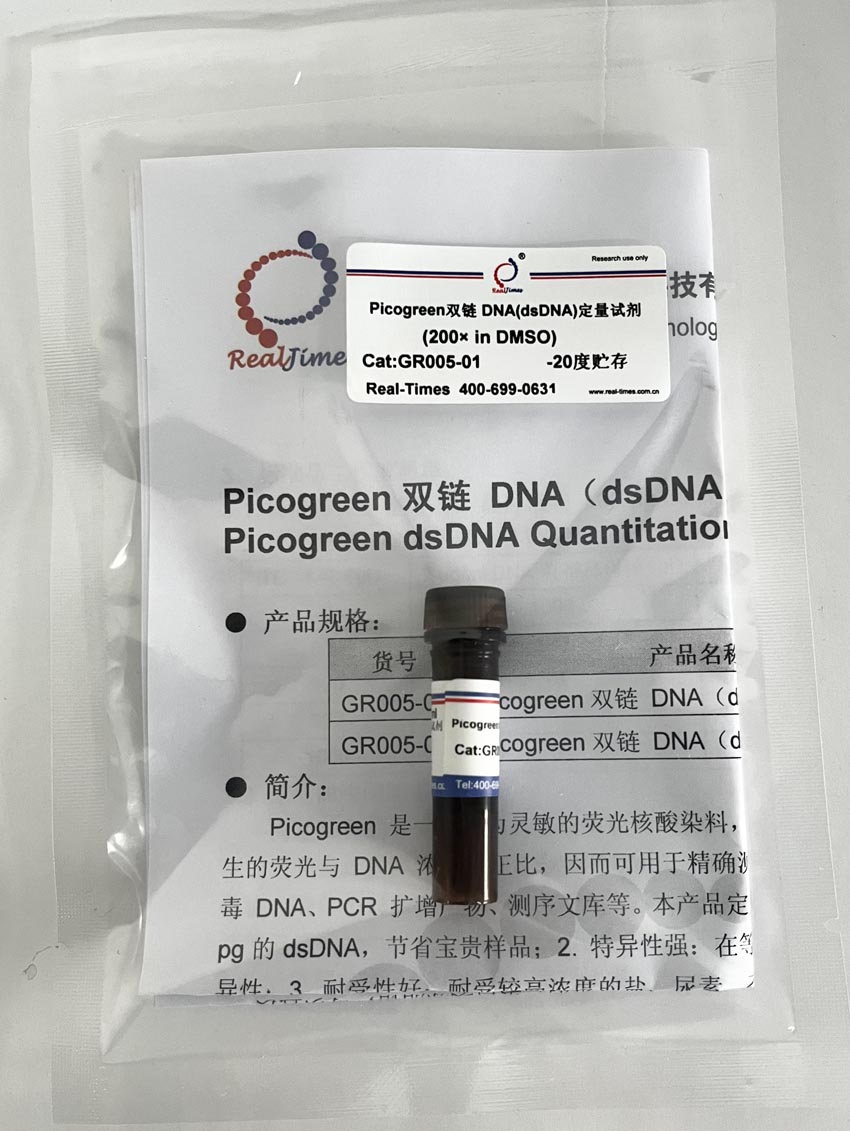 Picogreen 是一種極為靈敏的熒光核酸染料,其僅在與DNA 雙鏈結(jié)合后才發(fā)出熒光,且所產(chǎn)生的熒光與 DNA 濃度呈正比,因而可用于精確測量多個(gè)來源的 dsDNA,包括基因組 DNA、病毒 DNA、PCR 擴(kuò)增產(chǎn)物、測序文庫等。本產(chǎn)品定量具有以下優(yōu)勢:1. 靈敏度高:可檢測低至200 pg的dsDNA,節(jié)省寶貴樣品;2. 特異性強(qiáng):在等摩爾的RNA存在的條件下,對dsDNA具有特異性;3. 耐受性好:耐受較高濃度的鹽、尿素、乙醇、氯仿、去垢劑、蛋白或瓊脂糖,可以直接定量PCR擴(kuò)增產(chǎn)物而無需從反應(yīng)混合物中純化DNA。4. 易于使用-只需在樣品中加入染料,等待5分鐘,然后讀數(shù)即可,且適用于96和384孔板;與大多數(shù)基于熒光的酶標(biāo)儀和熒光計(jì)兼容。5. 適用范圍廣:可適用于PCR的分析、芯片樣品、DNA損傷分析、酶活分析、基因組DNA定量以及復(fù)雜混合物中dsDNA的檢測和病毒DNA定量等多種領(lǐng)域。
