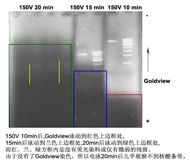 注:預(yù)染法,Goldview染色會(huì)出現(xiàn)陰陽(yáng)膠現(xiàn)象,即隨著電泳時(shí)間延長(zhǎng),較小的片段會(huì)染色不清楚,(參見(jiàn)實(shí)驗(yàn)示例),此時(shí)可以將凝膠用后染法染色即可看到小片段條帶。