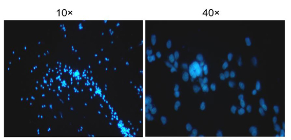 1.2.6 熒光顯微鏡下紫外激發(fā),可檢測(cè)到呈藍(lán)色的細(xì)胞核。激發(fā)波長(zhǎng)350 nm左右,發(fā)射波長(zhǎng)460 nm左右。