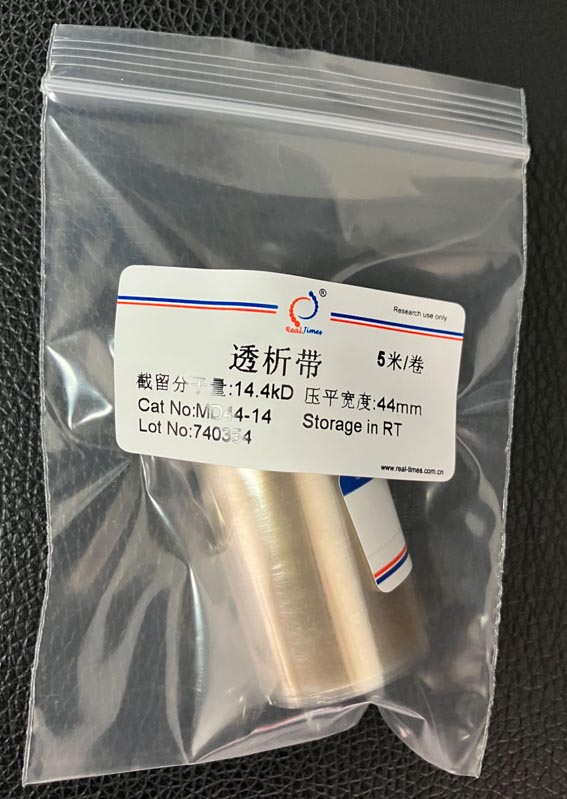 透析膜可用動(dòng)物膜和玻璃紙等,但用的最多的還是用纖維素制成的透析膜,目前常用的是美國(guó)Union Carbide (聯(lián)合碳化物公司)和美國(guó)光譜醫(yī)學(xué)公司生產(chǎn)的各種尺寸的透析管,截留分子量MWCO(即留在透析袋內(nèi)的生物大分子的最小分子量)。截留分子量越大也就是說(shuō)透過(guò)性越大。
