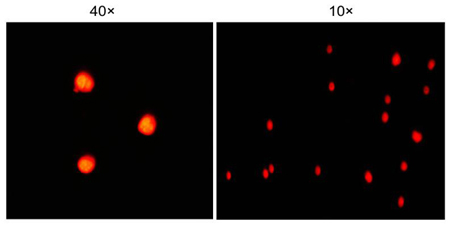2.7熒光顯微鏡下觀察可檢測(cè)到呈紅色的細(xì)胞核。激發(fā)波長(zhǎng)為535 nm,發(fā)射波長(zhǎng)為615 nm。
