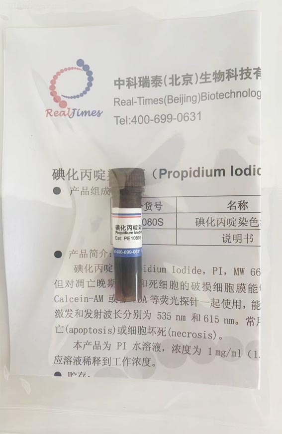 碘化丙啶(propidium iodide,PI),分子式C27H34I2N4 ,MW 668.39,CAS:25535-16-4。碘化丙啶不能穿過(guò)完整的活細(xì)胞膜,即正常細(xì)胞和凋亡細(xì)胞在不固定的情況下對(duì)PI拒染,而壞死細(xì)胞由于失去膜的完整性,PI可進(jìn)入細(xì)胞內(nèi)與DNA結(jié)合,根據(jù)此特點(diǎn),使用PI染色可鑒別死細(xì)胞。如果使用PI對(duì)活細(xì)胞染色必須在染色前進(jìn)行固定,以增加細(xì)胞膜對(duì)染料的通透性。PI經(jīng)常被用來(lái)與 Calcein-AM 或者 FDA等熒光探針一起使用,能同時(shí)對(duì)活細(xì)胞和死細(xì)胞染色。 PI-DNA復(fù)合物的激發(fā)和發(fā)射波長(zhǎng)分別為 535 nm 和615 nm。常用于流式細(xì)胞儀分析和顯微鏡觀察,檢測(cè)細(xì)胞凋亡(apoptosis)或細(xì)胞壞死(necrosis)。