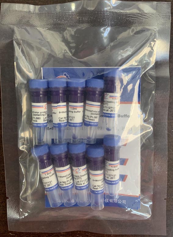 5×SDS-PAGE蛋白上樣緩沖液 (還原)是以溴酚藍(lán)為染料,5倍濃縮的SDS-PAGE凝膠電泳上樣緩沖液,應(yīng)用于還原型SDS-PAGE的蛋白樣品制備和上樣。該緩沖液中含有DTT,可使蛋白質(zhì)分子的鏈內(nèi)二硫鍵和鏈間二硫鍵斷裂,通過二硫鍵連接的各蛋白亞單位彼此分離,經(jīng)考馬斯亮藍(lán)染色以后在電泳凝膠上顯現(xiàn)清晰蛋白條帶。