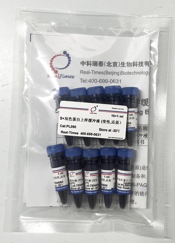 5×雙色蛋白上樣緩沖液(變性,還原)是5倍濃縮的SDS-PAGE凝膠電泳上樣緩沖液,應(yīng)用于還原型SDS-PAGE的蛋白樣品制備和上樣。該緩沖液中含有兩種示蹤染料:藍(lán)色的溴酚藍(lán)和一種紅色染料,可以指示SDS-PAGE電泳過(guò)程以及Weastern blot的轉(zhuǎn)膜效率。該緩沖液已經(jīng)加入DTT,可使蛋白質(zhì)分子的鏈內(nèi)二硫鍵和鏈間二硫鍵斷裂,經(jīng)考馬斯亮藍(lán)染色以后在電泳凝膠上顯現(xiàn)清晰蛋白條帶。