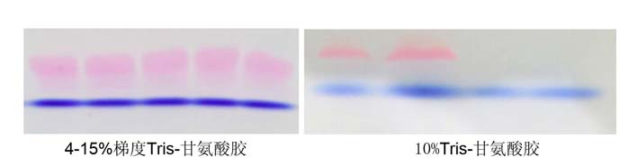 2.  一般說(shuō)來(lái),電泳中紅色染料泳動(dòng)速度快于溴酚藍(lán),但在高濃度SDS-PAGE膠中(高于
