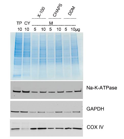 樣品:TP為RIPA提取總蛋白做對(duì)照;CY為膜蛋白提取上清-胞漿蛋白;M為使用不同去垢劑提取的膜蛋白