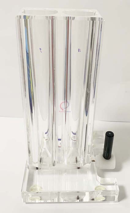 梯度混合儀能使盛放濃縮、稀釋溶液的兩杯液位保持平衡?兩杯溶液混合速度以及輸出流量均可調(diào)節(jié)?且可做出各種不同斜率的線形梯度。使用時接近出口的杯體盛放低濃度的液體,遠離出口的杯體盛放高濃度的液體。與多板制膠器配合使用時,比如制作4-20%梯度膠時,接近出口的放4%的溶液,遠離出口的放20%的溶液。