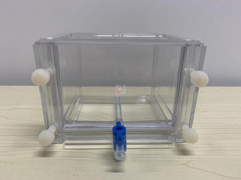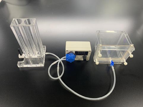 檢查無誤后,打開蠕動泵,使用a模式,調節(jié)數(shù)字為25,開始灌膠操作。至多板制膠器中的溶液至頂部接近溢出時,首先關閉多板制膠器藍色閥門(旋鈕與硅膠管垂直為關閉);