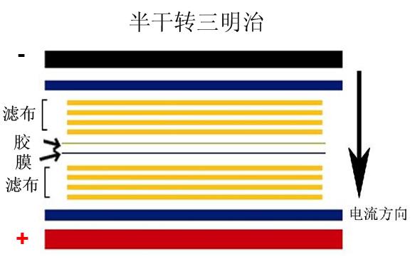 5.1 排列順序(圖一):1 負極(陰極)-2一張超厚濾紙或四層濾布-3 凝膠-4 轉(zhuǎn)印膜-5一張超厚濾紙或四層濾布-6 正極(陽極)