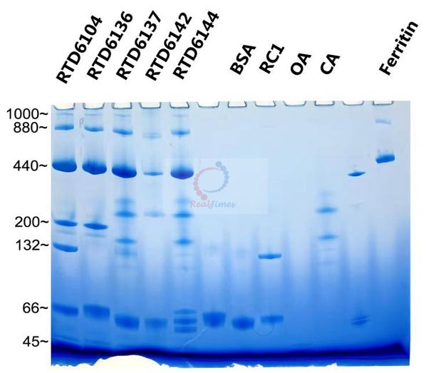 2. 非變性蛋白電泳Marker由于要保持蛋白的天然結(jié)構(gòu),都沒有偶聯(lián)染料,在電泳時基本都看不到條帶;但是RTD6104中的440