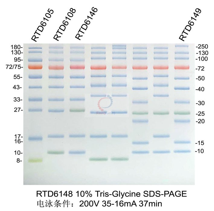 本產品包含10種純化的預染蛋白質組成,分子量范圍為10-180kD,其中70kD條帶為紅色,10kD條帶為綠色,其余條帶為藍色,可以用于SDS-PAGE和Western Blot轉膜時確定未知蛋白的分子量。