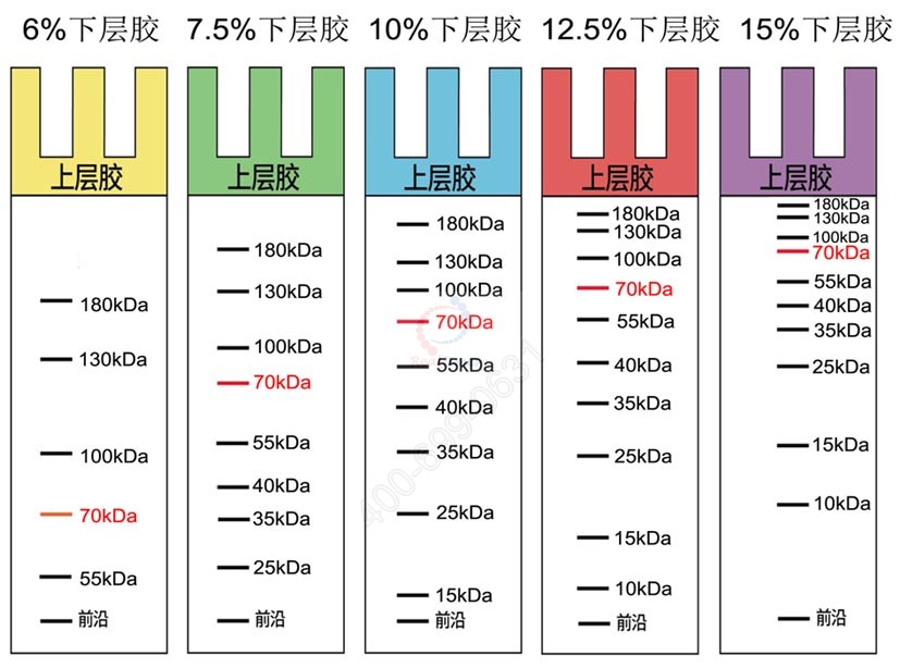 kDa,含有 10 條蛋白條帶 ) 在不同濃度的 SDS-PAGE凝膠中的分離示意圖。因溫度、pH 值等因素不同,實(shí)際分離情況會(huì)略有出入,本圖僅供參考。