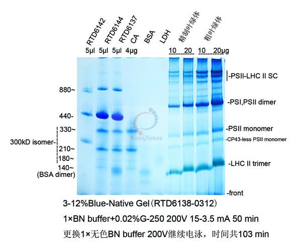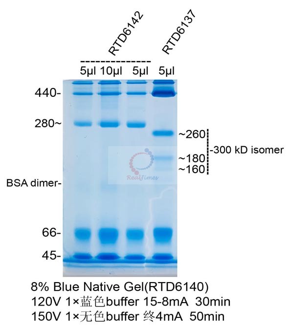2. 該產(chǎn)品不含蛋白凝膠制備試劑,您可以選擇非變性PAGE凝膠制備及電泳試劑盒(貨號(hào):RTD6130)或者蛋白預(yù)制膠(貨號(hào)RTD6118)。如自備試劑,經(jīng)典Laemmli系統(tǒng)中把制膠溶液、電泳緩沖液和上樣緩沖液中的SDS和還原劑(DTT或β-巰基乙醇)全部去除即可進(jìn)行非變性電泳。