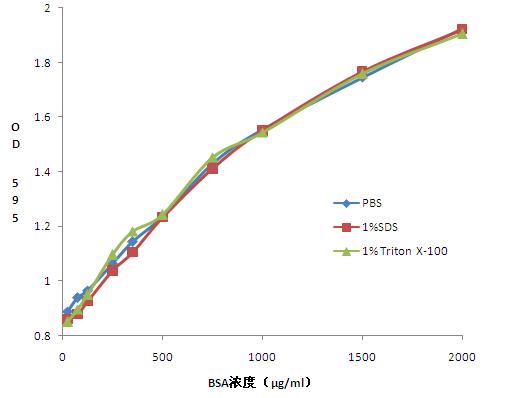 mM。同時(shí),此方法測(cè)定蛋白濃度可以兼容受高濃度的去垢劑影響,可以適用于膜蛋白樣品的濃度測(cè)定。蛋白樣品中SDS濃度低于1%,Triton