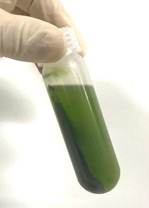 1.6.1.3 4℃ 3200 g離心30分鐘,綠色沉淀為完整葉綠體(下圖)。