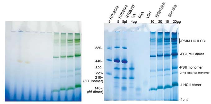 2.2.2.4 葉綠體蛋白溶液中加入1/10體積類囊體膜上樣緩沖液(10×),使用BN凝膠電泳(貨號:RTD6139,RTD6140),每個泳道上樣5-20 μg。