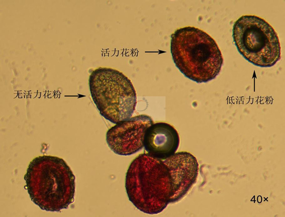 3. 在顯微鏡下觀察,凡具有生活力的花粉呈紅色,部分喪失生活力的呈淡紅色,無色的是死的和不育的花粉粒。